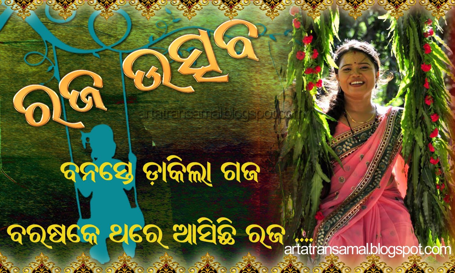 Raja parba:  The falls in mid June, the first day is called Pahili Raja, second day is Mithuna Sankranti, third day is Bhu daaha or Basi Raja. The final fourth day is called Vasumati snan, in which the ladies bath the grinding stone as a symbol of Bhumi with turmeric paste and adore with flower, sindoor etc. All type of seasonal fruits are offered to mother Bhumi. The day before first day is called Sajabaja or preparatory day during which the house, kitchen including grinding stones are cleaned, spices are ground for three days. During these three days women and girls take rest from work and wear new Saree, Alata, and ornaments.It is similar to Ambubachi Mela. The most popular among numerous festivals in Orissa, Raja[5] is celebrated for three consecutive days. Just as the earth prepares itself to quench its thirst by the incoming rain the unmarried girls of the family are groomed for impending matrimony through this festival. They pass these three days in joyous festivity and observe customs like eating only uncooked and nourishing food especially Podapitha, do not take bath or take salt, do not walk barefoot and vow to give birth to healthy children in future.